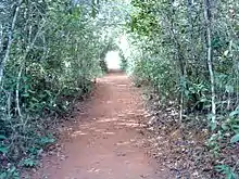 The 90-minute Sumidouro trail starts at the Casa Fernão Dias and passes through the historical landmark "Cruz do Pai Mané". It leads to the Sumidouro lagoon gazebo, which gives a view of the surrounding region, and then to the Gruta do Sumidouro (Sumidouro Ccave), which has cave paintings thousands of years old.[2] The Gruta do Sumidouro is where Peter Lund found human bones mingled with bones of extinct megafauna, and removed about 30 skulls of "Lagoa Santa Man".[1] The trail returns to the Casa Fernão Dias along the edge of the Sumidouro lake. The trail is medium difficult and must be scheduled in advance.[2]
