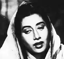 She sustained her career in Bengali cinema also with films such as Abhijog (1947), Pather Dabi (1947), Pratibad (1948), Joyjatra (1948), Swami (1949), Devi Chowdhurani (1949), Samar (1950), Dasyu Mohan (1955).[8] She has been idolized for her role as the beautiful alcoholic wife of a landlord in Kartik Chattopadhyay's cult classic Saheb Bibi Golam (1956) which is an adaptation of Bimal Mitra's classic novel of the same name.[10][11] Her portrayal of Bijali, a nautch girl with a bereaved heart in Haridas Bhattacharya’s National Award winning Bengali film Aandhare Alo (1957) acquired an overwhelmed critical response.[12][10] She also garnered acclamation for her roles in Bengali films such as Ekdin Ratre (1956), Nilachaley Mahaprabhu (1957), Joutuk (1958) and Kinu Gowalar Gali (1964).[10][5] In the late fifties, she was invited to the Asian Film Festival in China as a delegate from India.[10]