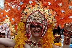 Although the street parade attracts the most visitors the Zomercarnaval is a multi-day event. A week prior to the street parade the new Queen is elected in the official Zomercarnaval Queen Election.[2] On the Thursday after the election the Zomercarnaval Beach Party is held at the Stand aan de Maas, a small beach created in the city center of Rotterdam. Several brass bands and DJ's show up and the newly chosen Queen is also present.[3] On Friday evening the Battle of Drums is held, an event in which several brass bands compete to be named the official Zomercarnaval brass band and earn a spot in the parade the day after as well as in the Notting Hill Carnival in London. The preliminaries for the Battle of Drums are held at the Dunya Festival in Rotterdam.[4] The street parade which is always held on Saturday includes brass bands and thousands of dancers. During and after the street parade there are two live on stage concerts at the Coolsingel and the Churchillplein until late in the evening.[5][6]