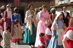 An important part of the components forming the current festive entourage of Reus were already documented in the 17th and the 18th centuries. The figure of the giants, the Mulassa, the dance of sticks, the dwarves and the devils have remained present throughout the years without interruption. Other old dances disappeared between the 18th and 19th centuries and were later recovered in the late 20th century. The gypsy dance, the dance of Joan de Vic, the dance of Prims, the Cercolets dance, the dance of the little horses, the dance of the Valencian people, the Galeras dance, the Bull of Reus, the dance of the Ladies and the Old Men, and the Eagle have been reintroduced to the festivity in an attempt to try and continue with the traditional events the old documents in town specify. Some of these elements are exceptional because they can only be viewed in Reus, as is the case of the dance of Prims, the dance of Joan de Vic, or the Galeras dance. Moreover, new elements have also been incorporated, based on typical elements of Catalonia. For example, the Cannon, the Giant Carrasclet, the dragon, the viper, the basilisk, the masquerade, the spoken dance of carrasclet, and the castles. These last ones, present in Reus since the 19th century, represent Reus' status as a fortified city.[3]