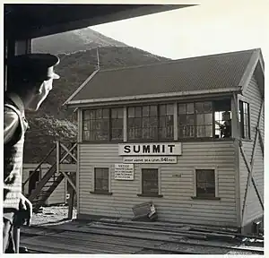 Summit railway station was at the summit of the Wairarapa Line over the Rimutaka Ranges in the Wellington region of New Zealand’s North Island and was where trains were marshalled for a descent down the Rimutaka Incline or for Fell locomotives to be extricated from a train that had ascended the Incline. The station was between Kaitoke and Cross Creek stations on the Wairarapa Line. The station was bypassed when the Rimutaka Tunnel was opened.