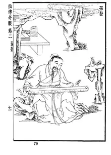 The Yuan dynasty (c. 14th century) Zengxiang liexian zhuan 增像列仙傳 "Enlarged and Illustrated Collected Biographies of Transcendents" elaborates on Ji/Xi Kang meeting Sun Deng, and mentions transcendental whistling in addition to zither playing.