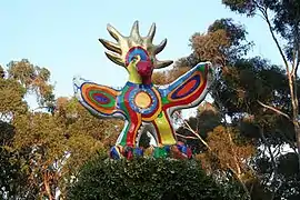 Sun God is a monumental statue by French-American sculptor Niki de Saint Phalle located on the campus of the University of California San Diego. The figurative sculpture is a 14-foot (4.3 m) multicolored bird-like creature, perched atop a 15-foot (4.6 m) tall arch-shaped, vine-covered concrete pedestal.