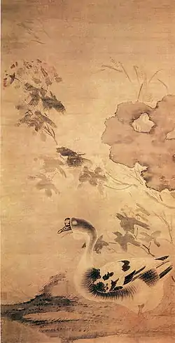 Swimming Goose by Flowers and Rocks (芙蓉游鹅图) Hanging scroll. Ink and color on silk. Width 84.2 cm, Height 159.3 cm. Palace Museum, Beijing.