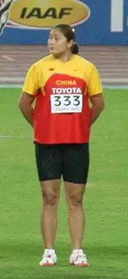 Her personal best throw is 64.98 metres, achieved in June 2007 in Suzhou. The Chinese, and Asian, record is currently held by Xiao Yanling with 71.68 metres.[1]
