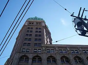 The Sun Tower is a 17 storey 82 m (269 ft) Beaux-Arts building at 128 West Pender Street in Vancouver, British Columbia. It was known for its faux-patina steel dome painted to imitate copper cladding. In early February 2021 a newly finished roof clad in real penny-coloured copper tiles was revealed. The new roof was a part of restoration work that began on the heritage building in 2018.[4] Nine nude muses, the "nine maidens" supporting the cornice line can be seen. The terracotta for this building, including the ladies, was made in Tamworth, Staffordshire, England by Gibbs and Canning Limited.