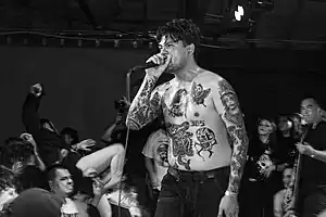 Their live debut was on October 26, 2019, which publications such as Stereogum noted for the obscenity of its moshing, which included people hardcore dancing in Halloween costumes, with boxing gloves and multiple people beginning to bleed despite the set only lasting eight minutes.[5] The performance took place at the San Jose Peace & Justice Center, a women and children's refuge center in San Jose, with the band performing in the smaller living room. The capacity of the room was only seventy but around one hundred people attended, with another one hundred people left outside. Drummer Benny Eissmann joined the band only hours before the performance, after Durrett had posted on his Instagram story asking whether anybody could play drums for it, with the band's first ever rehearsal taking place the same day. Videos of the performance began gaining traction on Twitter and in the following week the band were offered spots to perform at FYA Festival and Sound and Fury Festivals. However, before these events could take place, the COVID-19 lockdowns began, leading to live performances being unable to go ahead.[2]