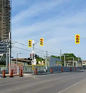 Sunnybrook Park is a surface light rail transit stop under construction on Line 5 Eglinton, a future line that will be part of the Toronto subway system.[2] It will be located at the intersection of Leslie Street and Eglinton Avenue. The intersection is largely surrounded by park lands in the valley of the West Branch of the Don River,[3] which includes destinations such as E.T. Seton Park, Serena Gundy Park, Wilket Creek Park, Sunnybrook Park and Edwards Gardens. This will be the westernmost at-grade surface stop.[2] The station is scheduled to open in 2024.[1]