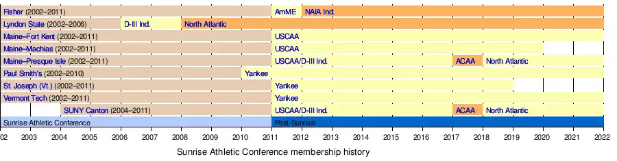 - 2011 – The Sunrise would cease operations as an athletic conference after the 2010–11 academic year; as many schools left to join their respective new home primary conferences, beginning the 2011–12 academic year: Fisher to join the American Mideast Conference, while the rest would leave the NAIA and join the USCAA: St. Joseph, Vermont Tech (now Vermont State–Lyndon), Maine–Machias to join the YSCC; and Maine–Fort Kent, Maine–Presque Isle and SUNY Canton to join as USCAA Independents (the latter two are either accepted or in the process into transition from the NAIA to NCAA Division III).