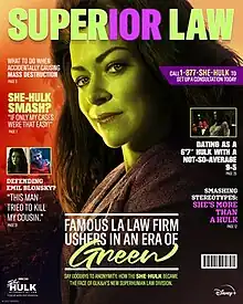 In August 2019, Marvel Studios announced that She-Hulk: Attorney at Law was being developed for the streaming service Disney+.[2][3] That November, Jessica Gao was hired to serve as the head writer.[4] In September 2020, Kat Coiro was hired to direct six episodes, including the second, and to executive produce the series.[5][6] Executive producers include Marvel Studios' Kevin Feige, Louis D'Esposito, Victoria Alonso, and Brad Winderbaum, in addition to Coiro and Gao.[3] The second episode, titled "Superhuman Law",[7] was written by Gao,[8] and was released on Disney+ on August 25, 2022.[9] The series' subtitle was added during the editing process when Feige heard Hulk's line from the episode, "She-Hulk attorney at law, it's got a nice ring to it", and felt it would be a good title for the series.[10] The episode's title card is altered to say She-Hulk: Attorney for Hire.[11]