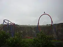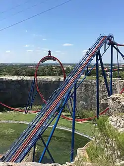 At the time of the ride's announcement, construction had already begun on unused land bordered by quarry walls and an irrigation pond.[5][6] The initial plans for the ride specified it would have seven inversions including a 114-foot-tall (35 m) vertical loop and a 96-foot-tall (29 m) dive loop.[6] Following the ride's announcement, the design was altered to remove the dive loop and increase the size of the vertical loop to 145 feet (44 m).[7][8] This saw Superman: Krypton Coaster obtain the record for the world's tallest vertical loop when it officially opened to the public on March 11, 2000.[7] It held the title for 13 years until the addition of Full Throttle at Six Flags Magic Mountain in 2013.[8]