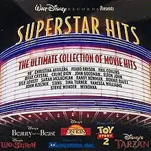 Superstar Hits is a compilation album released in 2002[1] and re-released in 2004[2] with new songs for tracks 12โ16 by Walt Disney Records. It features songs from popular Disney movies by mainstream artists like Celine Dion, Regina Belle, Elton John, Phil Collins, Vanessa Williams, Tina Turner, and Christina Aguilera.