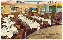 The first supper club in the United States was established in Beverly Hills, California, by Milwaukee, Wisconsin native Lawrence Frank.[3] Supper clubs became popular during the 1930s and 1940s, although some establishments that later became supper clubs had previously gained notoriety as prohibition roadhouses.[4]