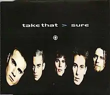 "Sure" is a single by English boy band Take That, released as the lead single from their third studio album, Nobody Else (1995). It was written by Take That's lead singer Gary Barlow and fellow band members Robbie Williams and Mark Owen.[4] Released on 3 October 1994 by RCA and BMG, the song became the band's fifth number one on the UK Singles Chart and has received a silver disc certification in the UK for selling over 200,000 copies. Q Magazine ranked "Sure" at number 86 in their list of the "1001 Best Songs Ever" in 2003.[5]