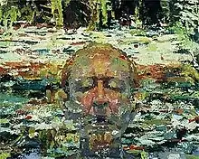 Coffey is best known for her paintings of heads―often self-portraits, such as her Self Portrait, Versace (Canal) Scarf in the collection of the Honolulu Museum of Art. Like many of her paintings, this 1996 self-portrait is a frontal view, lit from behind. Hearne Pardee describes her practice in the Brooklyn Rail: