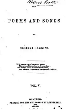 - ↑ Hawkins, Susanna (1841). The Poems and Songs of Susanna Hawkins. Printed for the authoress by J. M 'Diarmid. Retrieved 28 October 2014.