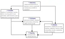 A further interesting example is provided by the Sustainability Flower which was developed in 2009 by an international group of prominent pioneers and innovators of the organic movement. The Flowers performance indicators were defined on the basis of the GRI Guidelines and seeks to unite four dimensions of sustainability (economic life, societal life, cultural life and ecology with six sub dimensions) in a model.[24]