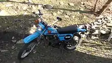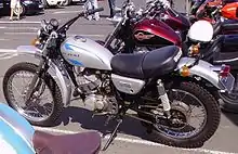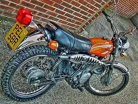 A factory race kit was available for the TS90 which consisted of an expansion chamber, light piston and rings, carburetor, and harder (colder range) plug and head which increased the size to 100 cc (6.1 cu in). In the North American market a 175cc race kit was available for the TS185. The 175 size was to match an established class. It consisted of an expansion chamber, new cylinder and head, piston, thin rings, larger carburetor, and much lower gearing. Different gearing was available for most models. The TF model (Mud Bug) was developed in the early 1970s and sold mainly in New Zealand and Australia.[5] The TF series was made in three sizes; 100 cc, 125 cc, and 185 cc engines. These bikes were based on the ER range. The TF125 is still in production. It has left-and-right side stands with large bases, a large rear carrier, headlight and lever protection, a single seat, bash plate, large mud flaps and knobby tyres.[6][7][8]