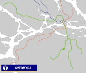 Svedmyra metro station is on the Green line of the Stockholm metro, located in Stureby, Söderort. The station was inaugurated on 1 October 1930 as part of the stretch between Gullmarsplan and Stureby.[2] The distance to Slussen is 5.2 km (3.2 mi).