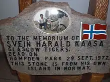 There is a memorial made from Norwegian stone at the Glasgow Tigers track in his memory.[1]
