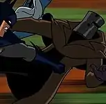 Unaware that Batman is no longer incapacitated, the Club of Villains begin targeting the other members of the Batman Family. Swagman is tasked with taking down Robin but is unable to do so.[9] The Batman of Zur-En-Arrh and members of the Batman Family and the Club of Heroes track down the Club of Villains to their base.[10] After a drawn out conflict, the Club of Villains are defeated and Batman returns to his former personality. During the conflict, Swagman is rendered unconscious by the Dark Ranger.[11]