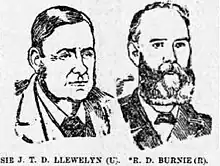 Shortly after Dillwyn's death, Ormesby-Gore withdrew and the Conservatives selected his nephew, Sir John Llewelyn as their candidate.[6] Llewelyn was commonly regarded as being the strongest candidate available to the Conservatives but due to the family connection he was unable to contest Swansea Town. The Liberals selected R.D. Burnie, who was well known for his radical views and was, as a result, popular amongst the working class electorate.[6] At his adoption meeting, Burnie declared himself sternly in favour of disestablishment, reflecting the views of his predecessor, but also expressed strong support for Home Rule for Wales as well as Ireland, thus placing himself firmly in the Cymru Fydd camp.[6]