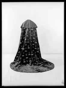 Eric XIV's coronation robe is the oldest garment that has been kept from a Swedish coronation. It is a velvet robe in a deep purple colour. Originally the robe was decorated with 455 golden crowns. The crowns are embroidered with golden, white, blue and pink silk, and on each crown ten small pearls were attached. Today only 296 of the crowns remain.[2] When king Eric was crowned the robe also had a trimming and a collar made out of ermine. After Eric XIV, John III, Charles IX and Gustav II Adolf have used the robe during their coronations.[3]