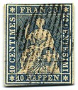 A number of values were printed between 1854 and 1862, ranging from 5 rappen to 1 franc, and philatelists distinguish them further by type of paper and color of thread. The commonest type surviving today is the 5-rappen brown on thick paper with a green thread, costing US$20 used; certain other types are rare, and the pale yellow-green shade of the 40-rappen value will go for $7,000 or more.
