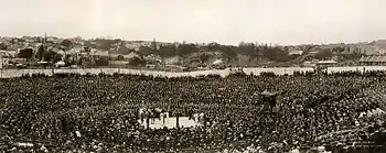 Macintosh originally built a temporary open-air stadium to promote a World heavyweight boxing championship title fight between Canadian world heavyweight champion Tommy Burns and Australian champion Bill "Boshter" Squires on 24 August 1908, which Burns won by a knockout in the 13th Round.[1] It also hosted the biggest sporting event in Australia's history up till then, where over 20,000 crammed in the stadium on 26 December 1908 to see Tommy Burns fight the African-American Jack Johnson. This fight captivated the world because it was the first time that a 'black' man fought for the prestigious World Heavyweight Boxing Championship, with Johnson winning to take the title.[2]