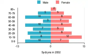 According to the 2002 Poland census, there were 124 people residing in Sydzyna village, of whom 50% were male and 50% were female. In the village, the population was spread out, with 28.2% under the age of 18, 35.5% from 18 to 44, 16.1% from 45 to 64, and 20.2% who were 65 years of age or older.[1]