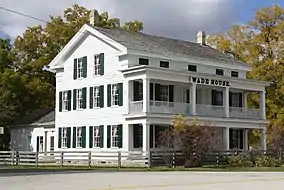 A three-story wooden Greek Revival house was built between 1848 and 1851.[4][note 1] It quickly gained attention for its large size and stylish appearance.[7] Wade began advertising his "Half Way House" in Sheboygan in 1849.[6] This, coupled with the inn's location halfway between the larger cities of Fond du Lac and Sheboygan, Wisconsin on the Fond du Lac-Sheboygan Plank Road,[8] made it a popular stopover for travelers during the 1850s and 1860s. However, when travel by horse and stagecoach became obsolete and the railroad between Sheboygan and Fond du Lac went through Glenbeulah to the north,[9] the house's full-time use as an inn was discontinued. Ironically, a railroad directors election meeting was held at the house in 1854.[10]