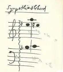 The earliest use of the name "sympathy" for instrumental musical work was by the German performer, poet, musician and thinker Natias Neutert. He introduced the word sympathy into the terminology of experimental music and performance art with his musical performance, titled Sympathy for Piano and Pump.[1][2]