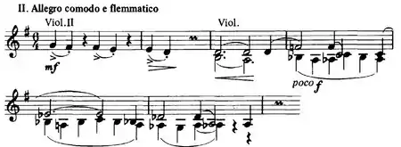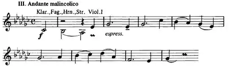 His real inclination was to lie where the birds sing, where the fish glide noiselessly through the water, where the sun warms and the wind strokes mildly round one's curls. He was fair; his expression was rather happy, but not self-complacent, rather with a hint of quiet melancholy, so that one felt impelled to be good to him... I have never seen him dance; he wasn't active enough for that, though he might easily have got the idea to swing himself in a gentle slow waltz rhythm, so I have used that for the movement, Allegro comodo e flemmatico, and tried to stick to one mood, as far away as possible from energy, emotionalism, and such things.[6]