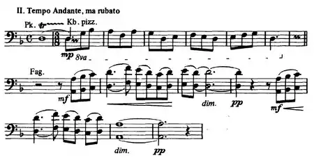 In his villa in Rapallo, Sibelius wrote: "Don Juan. I was sitting in the dark in my castle when a stranger entered. I asked who he could be again and again – but there was no answer. I tried to make him laugh but he remained silent. At last the stranger began to sing – then Don Juan knew who it was. It was death."[16] On the same piece of paper, he wrote the bassoon theme for the first part of the second movement, out of which a pizzicatoed string "walking bass" stems. Two months later in Florence, he drafted the second theme, with a note reading "Christus," perhaps symbolizing the death and resurrection of the movement, or even of Finland.[6] Scholars also suggest that Sibelius modeled the second movement after Dante's Divine Comedy. Nonetheless, Robert Kajanus said that the movement "strikes one as the most broken-hearted protest against all the injustice that threatens at the present time to deprive the sun of its light and our flowers of their scent."[17] The movement culminates with a towering, brassy theme, following by an ethereal, mist-like motif in the divided strings.[18]