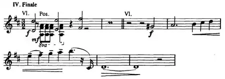 Without pause, the final movement, toward which the rest of the symphony seems to be building, begins gloriously after finally attaining D major, with colossal, loud, regal, and triumphant themes, often drawn from the first movement of the symphony.[19] Very similar to Beethoven's Symphony No. 5, the transitional material from between the last two movements is brought back a second time so the victory of the major key can be savored anew.[18] This movement, inspired by Romantic music, is "Italian music gone North."[20] Kajanus wrote that the last movement "develops towards a triumphant conclusion intended to rouse in the listener a picture of lighter and confident prospects for the future."[11]