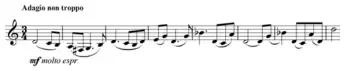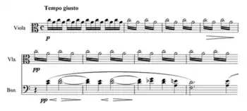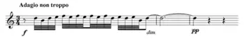 An oboe triplet figure then reveals the warm theme in G major of the Adagio non troppo section, a contrast to the prior cold landscape.[22] The texture expands contrapuntally for the first time; the tonality brightens to B major and, after a climax, wanes to G major again.[23] The full strings are soon disturbed by an "evil" motif on woodwinds, playing the shivering element from the work's opening; tension between wind and strings intensifies as tonality shifts within instrumental groups in their respective directions.[24] With a further clash, the music is menaced by the snare drum at a tempo (quarter note ♩=116) faster than that of the orchestra, and at its climax comes the composer's instruction to the snare drummer to improvise "as if at all costs he wants to stop the progress of the orchestra".[25] (This instruction is not included in the 1950 edition of the score, being replaced by a written rhythmic line and instruction "cad. ad lib." after a few bars.[9]) The warm theme eventually triumphs in a sustaining grandeur, as is affirmed by the snare drum actually joining the orchestral fanfare.[25] When all subsides, echoes in woodwinds are heard and a solitary clarinet is left to mourn in a tragic atmosphere, recapturing ideas from the whole movement:[26] "Who would have thought that so much could have come out of a gently waving viola line in empty space?"[27]