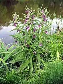 Symphytum officinale is a perennial flowering plant in the family Boraginaceae. Along with thirty four other species of Symphytum, it is known as comfrey. To differentiate it from other members of the genus Symphytum, this species is known as common comfrey[1] or true comfrey. Other English names include boneset, knitbone, consound, and slippery-root.[2] It is native to Europe, growing in damp, grassy places. It is locally frequent throughout Ireland and Britain on river banks and ditches. It occurs elsewhere, including North America, as an introduced species and sometimes a weed. The flowers are mostly visited by bumblebees.[3] Internal or long-term topical use of comfrey is discouraged due to its strong potential to cause liver toxicity.[4]