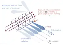Synchrotron radiation (also known as magnetobremsstrahlung radiation) is the electromagnetic radiation emitted when relativistically charged particles are subject to an acceleration perpendicular to their velocity (a v). It is produced artificially in some types of particle accelerators or naturally by fast electrons moving through magnetic fields. The radiation produced in this way has a characteristic polarization, and the frequencies generated can range over a large portion of the electromagnetic spectrum.[1]