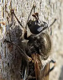 Large flies that strongly resemble bumblebees. The larvae of, M. cimhiciformis (Fallen) and M. posticata (Fabricius) develop in detritus-containing rot pockets, usually wet tree holes in upright deciduous trees. [26]