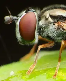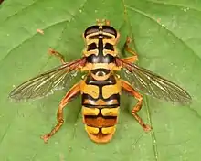 Many species in Spilomyia are wasp mimics with black and yellow patterns and using the black front legs to imitate the wasp antennae. [39] The eyes on Spilomyia species are a distinctive characteristic which usually display vertical, and irregular stripes or blotches.[40]