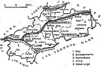 Administratively, Târnava-Mică County was made up of three cities – Diciosânmartin, Ibașfalău (Elisabetopol, Elisabethstadt, Erzsébetváros), and Blaj – and initially four districts (plăși):[1]