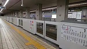 There are two sets of automatic ticket gates, the North Gates, beyond which are Exit 1 and Exit 4, and the South Gates, beyond which are Exit 2 and Exit 3. Each platform has an elevator and an up escalator. Near Exit 4 is a public telephone. There are handicapped-accessible bathrooms with a baby changing area inside the North Wicket. On Platform 1 for Nagoyakō Station, train door 1 is closest to the elevator, and train doors 1 and 18 are closest to the stairs and the escalators. On the opposite platform, Platform 2 for Kanayama Station, train door 18 is closest to the elevator and escalator, and doors 1 and 18 are closest to the stairs. [2] [3]