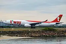 The airline was established on 8 August 2010 with two Boeing 737-800s.[10] The following month, the airline obtained an air operator's certificate (AOC) permitting domestic flights and commenced operations with services between Gimpo International Airport and Jeju International Airport.[11] The following year an AOC for international operations was awarded and in October it launched the first international service, to Bangkok.[12] In 2013, the airline achieved a profit for the first time.[13] In November that year cargo services were launched.[14] In March 2014, T'way Air introduced its seventh Boeing 737-800 aircraft. In April 2022, T'way Air received its first Airbus A330.[15][16] In October 2022, T'Way announced it will serve the connection between Incheon and Sydney, which will be its first long-haul connection.[17][18]