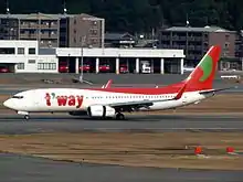 A T'Way Air Boeing 737-800 at Fukuoka Airport in Japan, 2012.