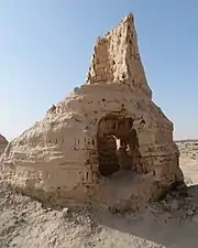 At the center of the site lies the foundation of a large temple building, north of which is the main pagoda standing 14.5 metres (48 ft) tall. The adobe structure is covered by white lime and is of the shape of an overturned bowl. North of the main pagoda are the remains of 11 smaller ones.[1][2] Most of the extant ruins date from the Western Xia dynasty, including all of the pagodas.[1][2]