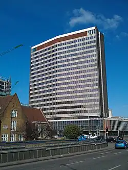 Taberner House, which was designed by architect H. Thornley, with Allan Holt as borough engineer and Hugh Lea as the borough architect, was built between 1964 and 1967.[1][2] Although the Croydon Corporation had needed extra space to supplement Croydon Town Hall since the 1920s, it was only with the imminent creation of the London Borough of Croydon that action was taken. It had its upper slab block narrowing towards both ends. It was named after Ernest Taberner OBE, Town Clerk from 1937 to 1963.[3]