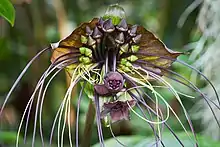 There are ten species in the genus Tacca.[5] T. chantrieri is often referred to as the bat flower, devil flower, or cat whiskers.[6] It is an unusual plant in that it has black flowers. T. chantrieri has bracts that look like wings and are large in area. The flower can be up to 12 inches across.[5] Its height can range anywhere from 50–100 cm tall. The bracteoles look like long whiskers hanging from a bat that can be 8-10 inches in length.[2] Some researchers believe that the bracteoles have photosynthetic properties.[6]
