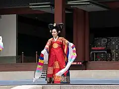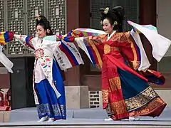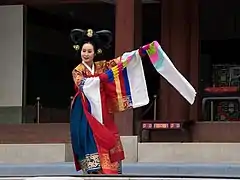Taepyeongmu (태평무; literally "great peace dance") is a Korean dance with the function of wishing a great peace for the country. Its exact origin is unknown, but certain style of the present was composed by Hahn Seongjun (hangul: 한성준; hanja: 韓成俊; 1874–1941), an outstanding master of Korean dance in the beginning of last century. There are three assumptions regarding the origin of Taepyeongmu. One is a court dance occasionally performed by kings during the Joseon dynasty. Therefore, the costumes used by the dancers are similar to the gwanbok (hangul: 관복; literally "official clothing") formerly worn by Korea's kings and queens.[1]
