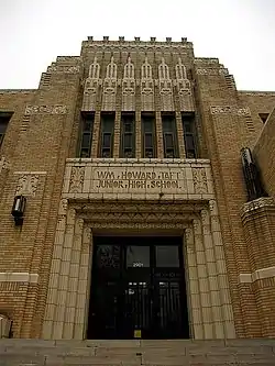 Taft Middle School is a historic Oklahoma City school. It is listed on the National Register of Historic Places as Taft Junior High School.[2] At 2901 NW 23rd Street, the school's art deco-style building was designed by Layton, Hicks & Forsyth and built in 1930.[3] The two-story building includes intricate brickwork, terra cotta, and cast stone adornments as well as friezes. It is constructed of yellow brick.[3]