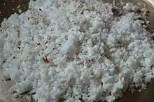 Kora made by Fijians is traditionally prepared by wrapping the grated coconut flesh in packages made from banana leaves and submerging it in salt water, weighed down under a pile of rocks and leaving it to ferment for several days, though modern day methods sometimes use sacks instead of banana leaves.[4][5] It is typically served mixed with sea grapes, chilli, lemon juice and salt.